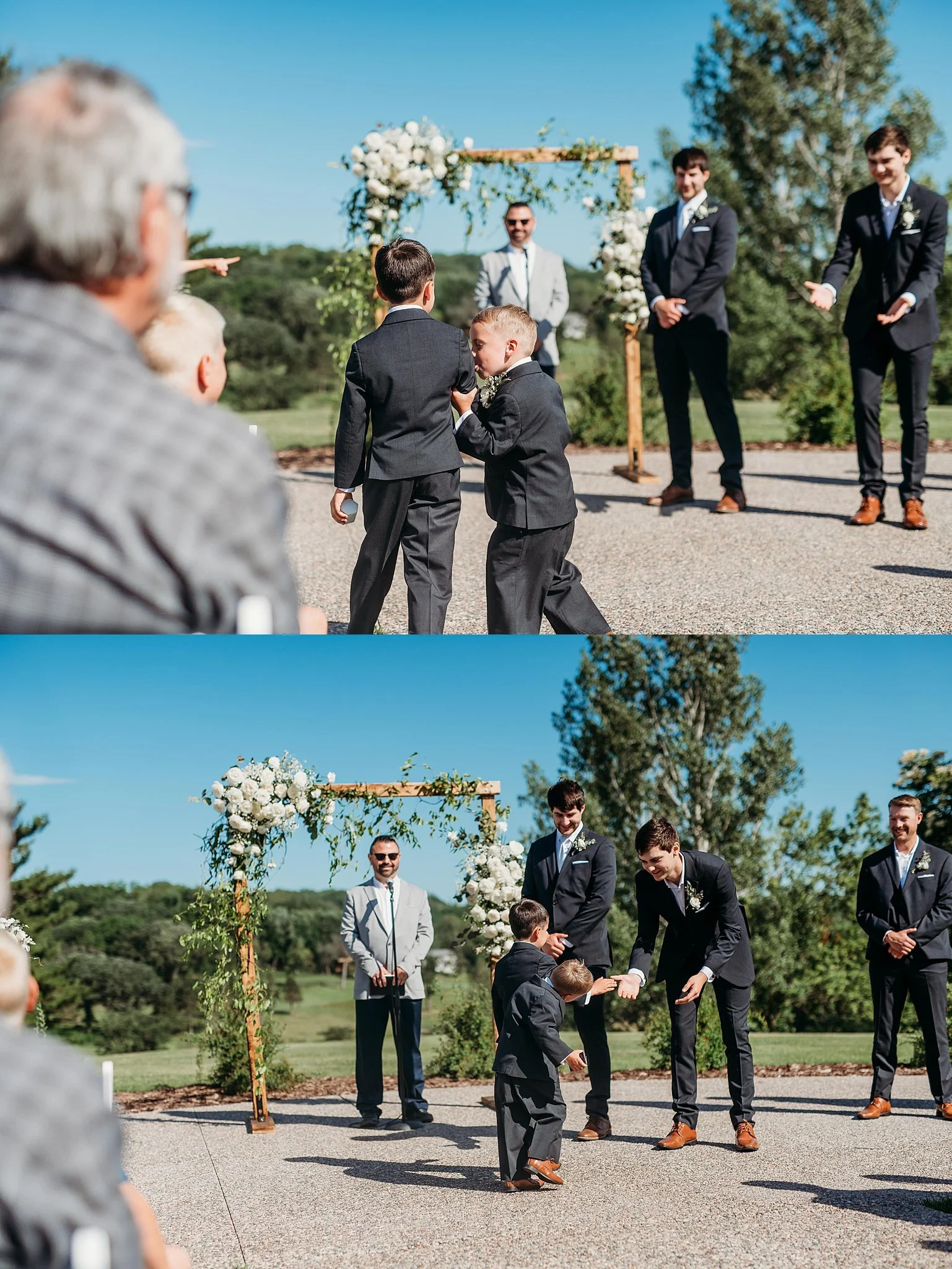 (Below a younger brother licked his older brother while performing ring bearer duties at a summer wedding at The Skyroom at Red Wing Golf Course.)